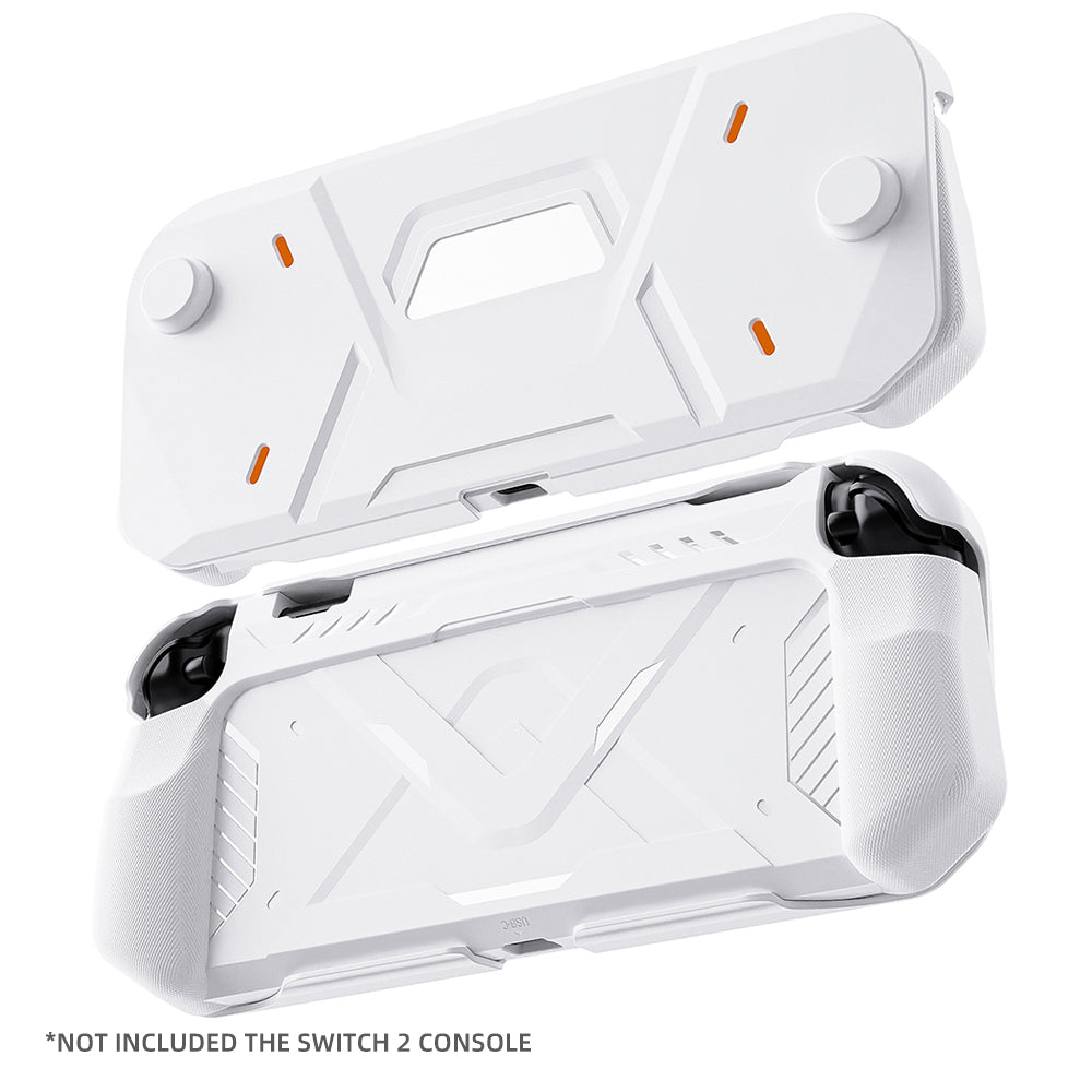 Futuristic mecha-style protective case designed for Nintendo Switch 2, combining shockproof TPU and hard PC shell for full-body protection. Raised bezels protect the screen, buttons, and joysticks from drops, scratches, and daily wear.