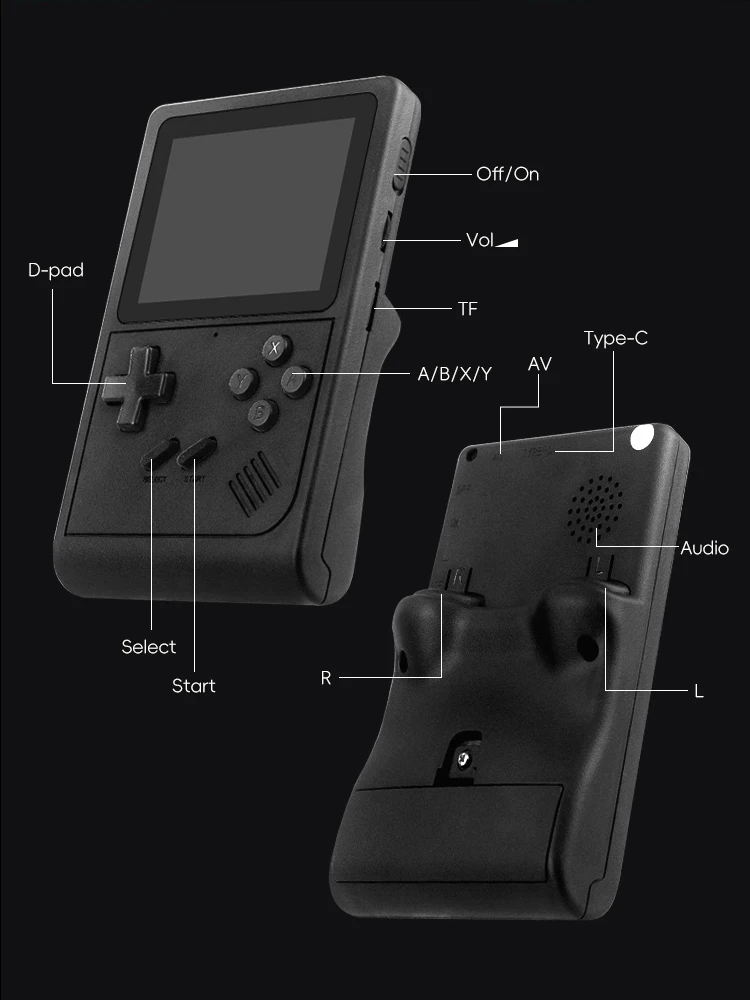 O console de jogos GB300 com interface AV permite que você conecte o console de jogos com tela HD à sua TV por meio da saída AV para jogos animados e emocionantes.