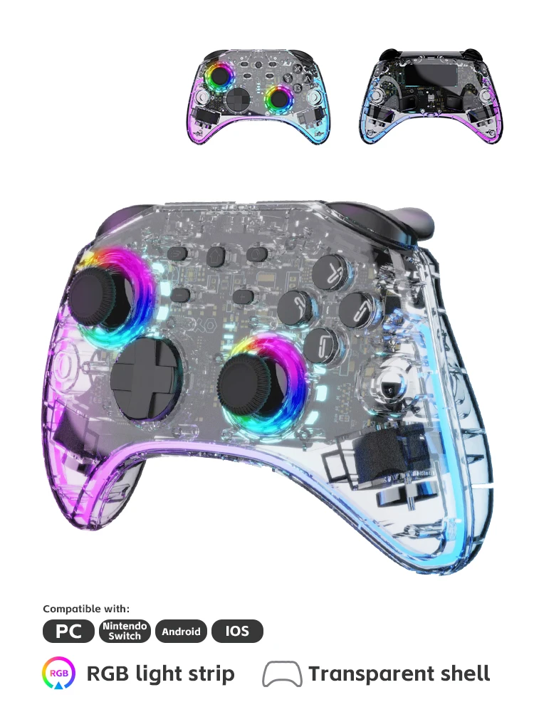 Kulaklık Jakı RGB Işık ile LED Şeffaf Kablosuz Oyun Kumandası, Nintend Switch OLED/ Steam Deck ile Uyumludur
